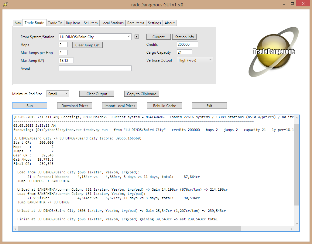 TDGUI is a lightweight GUI front end for TradeDangerous, a power-user trade optimizer for Elite Dangerous. The TDGUI 2.0 release adds support for Elite Dangerous: Horizons. Requires Microsoft .NET Framework 4.5.1 and Visual C++ Redistributable Package for Visual Studio 2013; see the readme.txt for installation instructions. More information is in this forum thread.